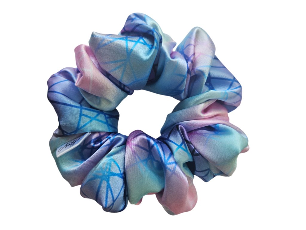 Proměňte svůj účes v umělecké dílo. Saténová scrunchie gumička Abstrakt je víc než jen doplněk – je to vyjádření vašeho stylu. Její jedinečný design s abstraktním vzorem v pastelových odstínech modré, fialové a růžové s geometrickými liniemi dodá vašemu vzhledu sofistikovanou a moderní eleganci.