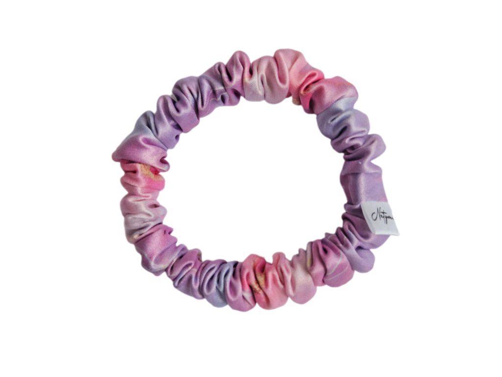 Saténová gumička od značky Natymi kombinuje stylový mramorový design v růžovo-fialových odstínech s maximální šetrností k vašim vlasům. Polomatný povrch dává vzoru pěkný vzhled, díky kterému barvy opravdu vyniknou a působí sytě. Jemné odlesky látky na světle vypadají přirozeně, takže gumička není nijak křiklavá a působí vkusně. Tento mírný lesk hezky doplní barvu vašich vlasů a celý účes díky němu vypadá upraveně.